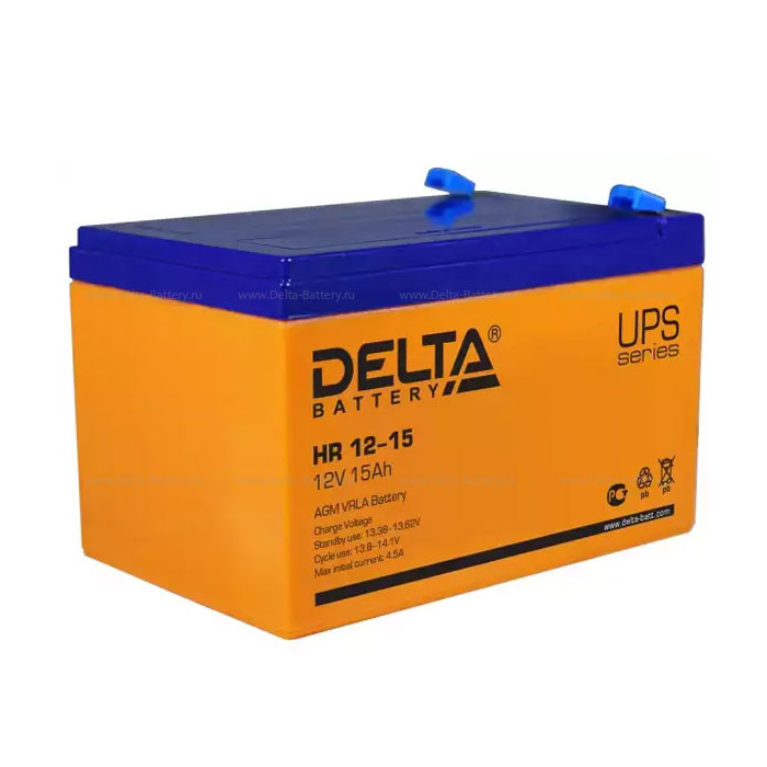 Герметизированный VRLA cвинцово-кислотный аккумулятор Delta HR 12-15 напряжением 12В и емкостью 15Ач изготовлен по технологии AGM (с микропористым заполнителем, пропитанным электролитом). Корпус изготовлен из негорючего ABS пластика. Срок службы аккумулятора достигает 8 лет. Аккумулятор относится к линейке DELTA UPS series и предназначен для работы в системах бесперебойного питания (ИБП), системах связи, ЦОД. Обладает низким внутренним сопротивлением и высокой плотностью энергии.