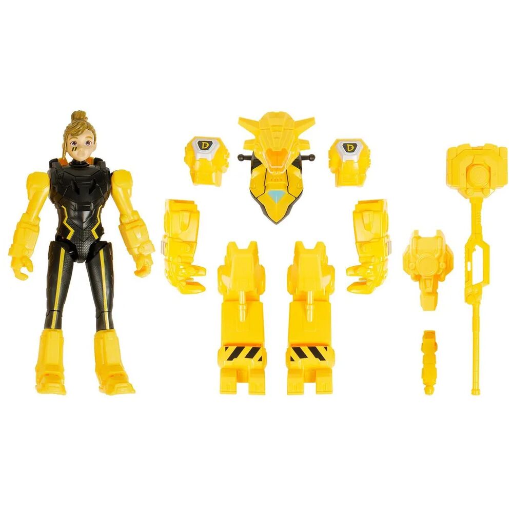 Фигурка Делби высотой 20 см имеет 2 формы игры: в Дино-костюме и без него. Дино-костюм позволяет становиться быстрее и сильнее. Надень и активируй Дино-костюм с помощью дополнительных элементов брони. Анкило-костюм, активация! Ударный молот!