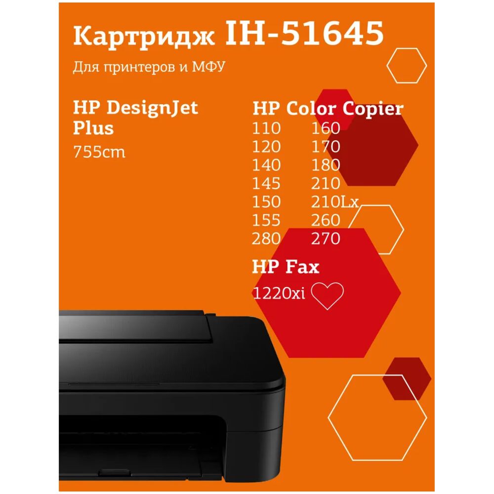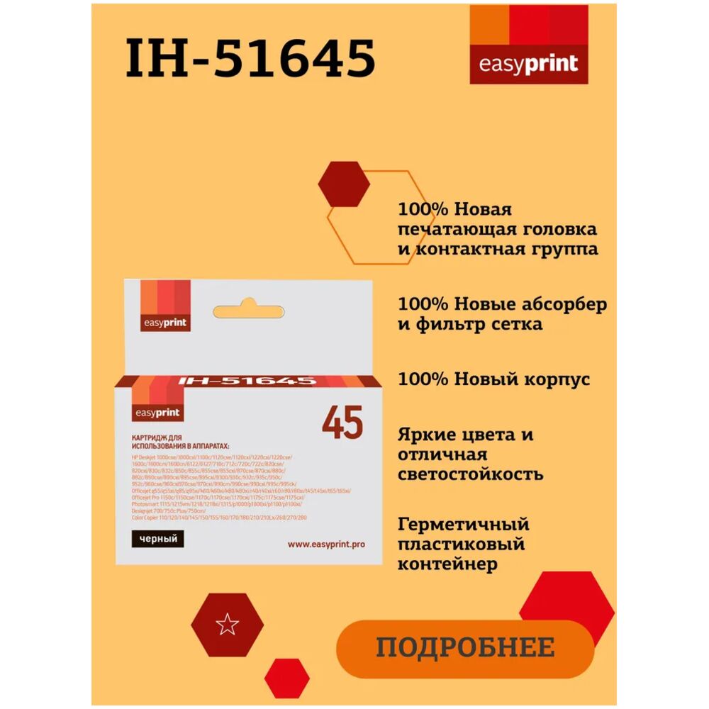Струйный картридж EasyPrint IH-51645 для принтеров HP, черный (black). Подходит для принтеров: HP Color Copier 110, 120, 140, 145, 150, 155, 160, 170, 180, 210, 210Lx, 260, 270, 280; HP DesignJet 700, 750c, 750c; HP DesignJet Plus 755cm; HP DeskJet 1000cse, 1000cxi, 1100c, 1120cse, 1120cxi, 1220cse, 1220cxi, 1600c, 1600cm, 1600cn, 6122, 6127, 710c, 712c, 720c, 722c, 820cse, 820cxi, 830c, 832c, 850c, 855c, 855cse, 855cxi, 870cse, 870cxi, 880c, 882c, 890cse, 890cxi, 895cse, 895cxi, 9300, 930c, 932c, 935c, 950c, 952c, 960cse, 960cxi, 970cse, 970cxi, 990cm, 990cse, 990cxi, 995c, 995ck; HP Fax 1220xi; HP Officejet g55, g55xi, g85, g85xi, k60, k60xi, k80, k80xi, r40, r40xi, r60, r80, r80xi, t45, t45xi, t65, t65xi; HP Officejet Pro 1150c, 1150cse, 1170c, 1170cse, 1170cxi, 1175c, 1175cse, 1175cxi; HP Photosmart 1115, 1215vm, 1218, 1218xi, 1315, p1000, p1000x,i p1100, p1100xi.