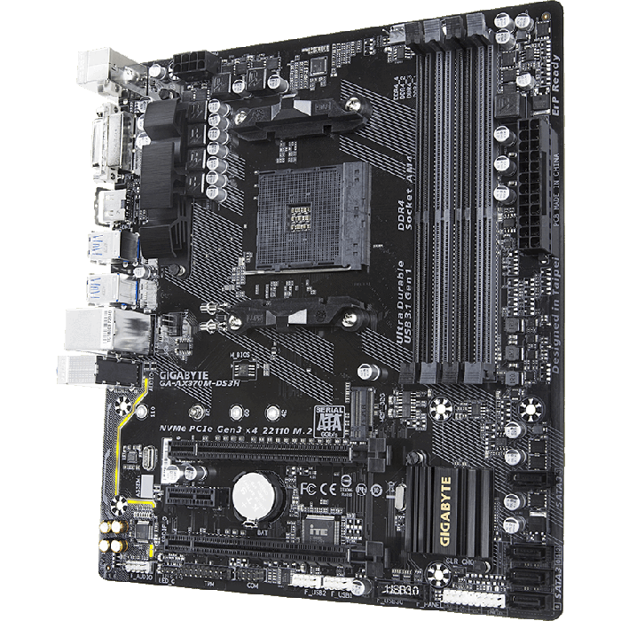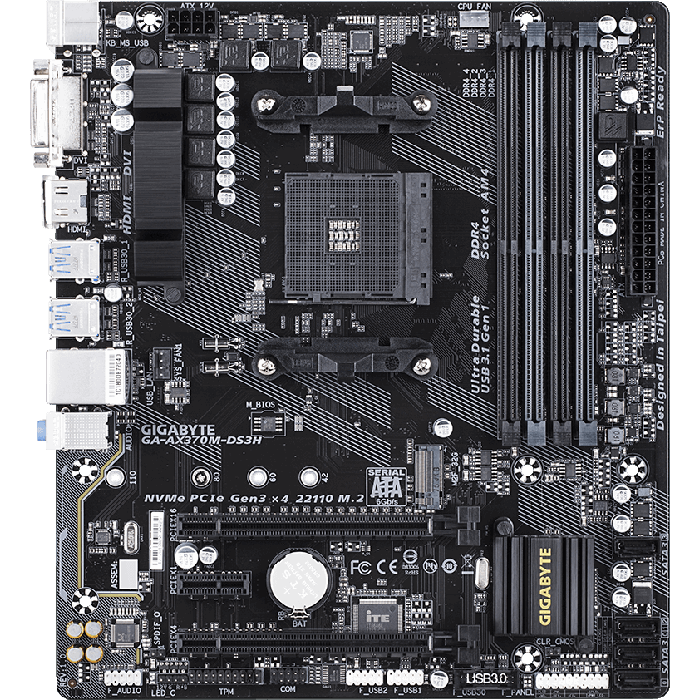 Материнская плата Gigabyte GA-AX370M-DS3H Socket-AM4 AMD X370 4xDDR4, 4xSATA3, Raid, 1xM.2, 2xPCI-E 16x, 4xUSB 3.1, DVI-D, HDMI, GLan, mATX Ret