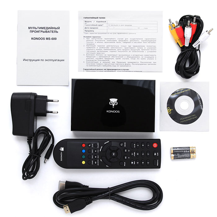 - Комплектация Адаптер питания, пульт ДУ, HDMI кабель, AV кабель, USB кабель, руководство по эксплуатации, батарейки
