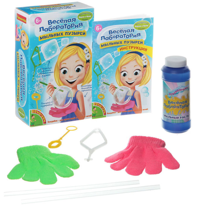 Всем наверняка доводилось видеть на улицах города умельцев, которые выдували огромные и яркие мыльные пузыри. С этим набором ты сможешь понять, что же такое мыльный пузырь, изучить его свойства и раскрыть секрет появления самого красивого пузыря! Можно даже будет устроить настоящую бурю из мыльных пузырей или перекидываться большим мыльным пузырем с помощью специальных перчаток. Также с помощью набора можно провести увлекательные эксперименты: сделать пузырь в пузыре, создать из мыльных пузырей червяка, торнадо! Попробуй этот набор и получи массу положительных эмоций! В состав набора входят 2 рамки, 2 соломки, раствор для надувания мыльных пузырей, 2 перчатки, инструкция.