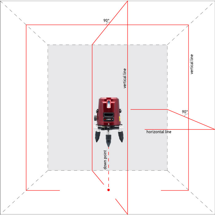 Нивелир ADA 3D LINER 4V строит 4 вертикальные линии (4V), 1 горизонтальную (Н), точку отвеса (D).