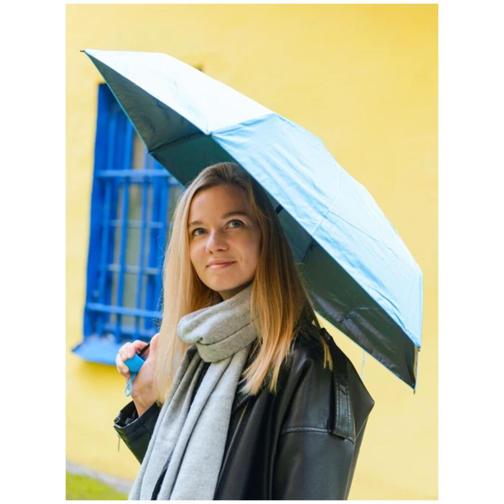 Легкая модель складывается в три приема. Благодаря небольшим размерам, она отлично помещается в бардачок автомобиля, рюкзак или сумку. Универсальный зонт голубого цвета можно преподнести в качестве подарка на любой праздник. Его характеристики: